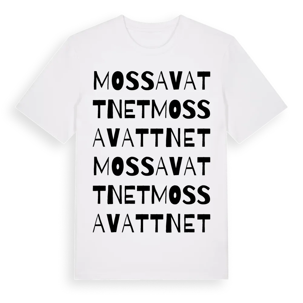 Mossavattnet ordlek t-shirt är inspirerad av byn Mossavattnet i Västerbottens län, Sverige. Tröjan är designad för dig som har en speciell koppling till platsen – oavsett om du bor här, har rötterna här eller bara älskar Mossavattnet.