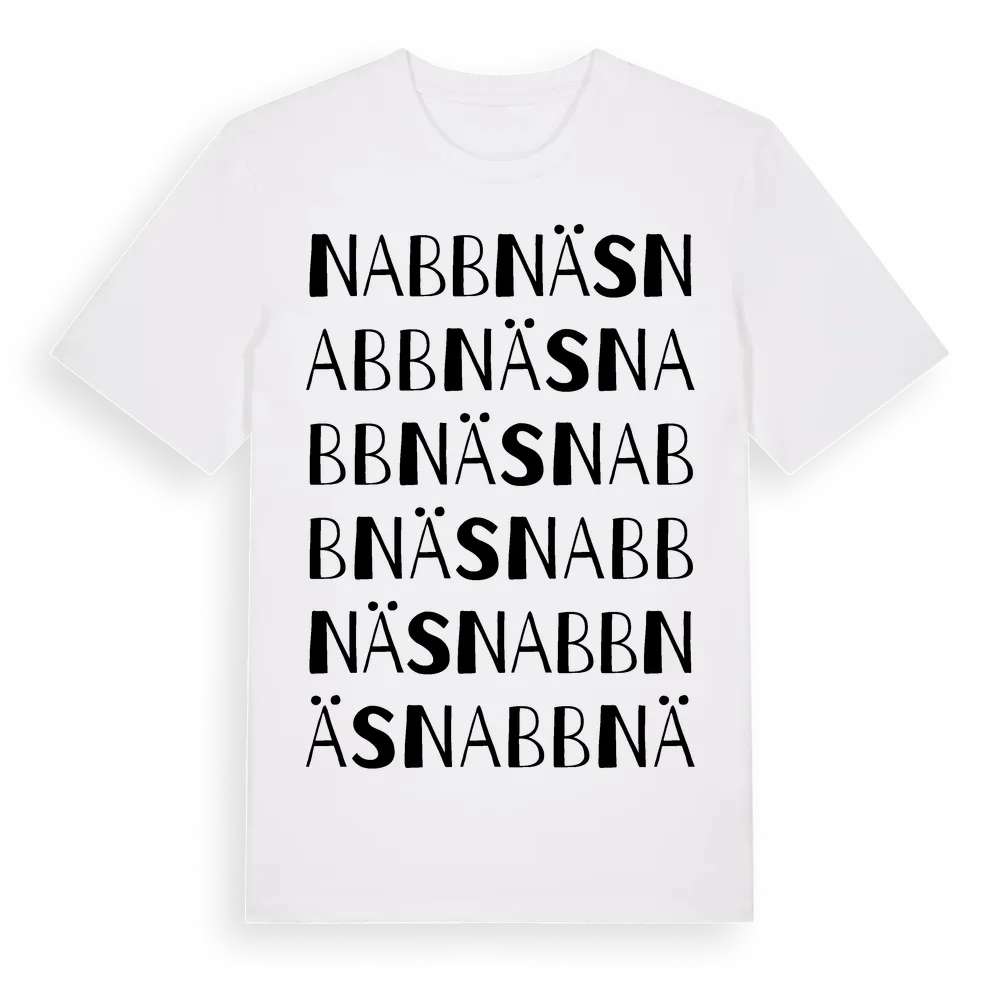Nabbnäs ordlek t-shirt är inspirerad av byn Nabbnäs i Västerbottens län, Sverige. Tröjan är designad för dig som har en speciell koppling till platsen – oavsett om du bor här, har rötterna här eller bara älskar Nabbnäs.