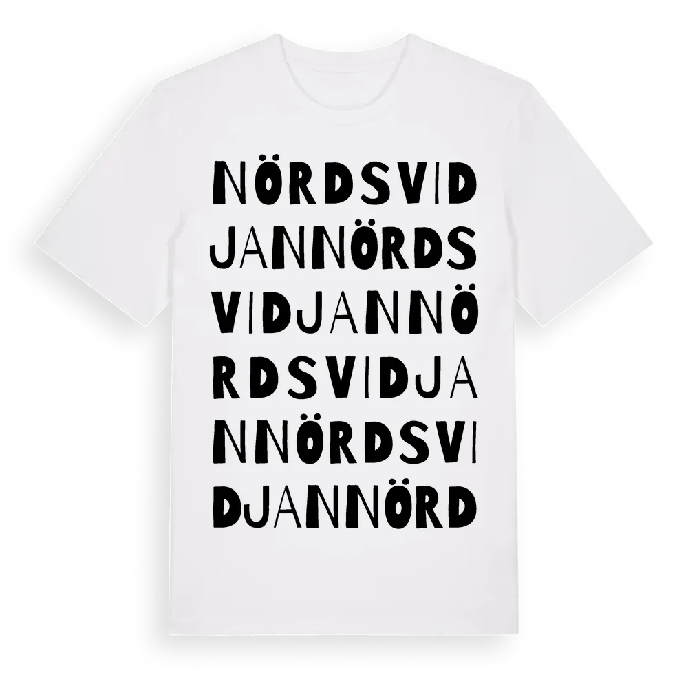 Nördsvidjan ordlek t-shirt är inspirerad av Nördsvidjan i Västerbottens län, Sverige. Tröjan är designad för dig som har en speciell koppling till platsen – oavsett om du bor här, har rötterna här eller bara älskar Nördsvidjan.