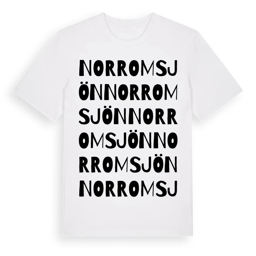 Norr Om Sjön ordlek t-shirt är inspirerad av Norr Om Sjön i Västerbottens län, Sverige. Tröjan är designad för dig som har en speciell koppling till platsen – oavsett om du bor här, har rötterna här eller bara älskar Norr Om Sjön.