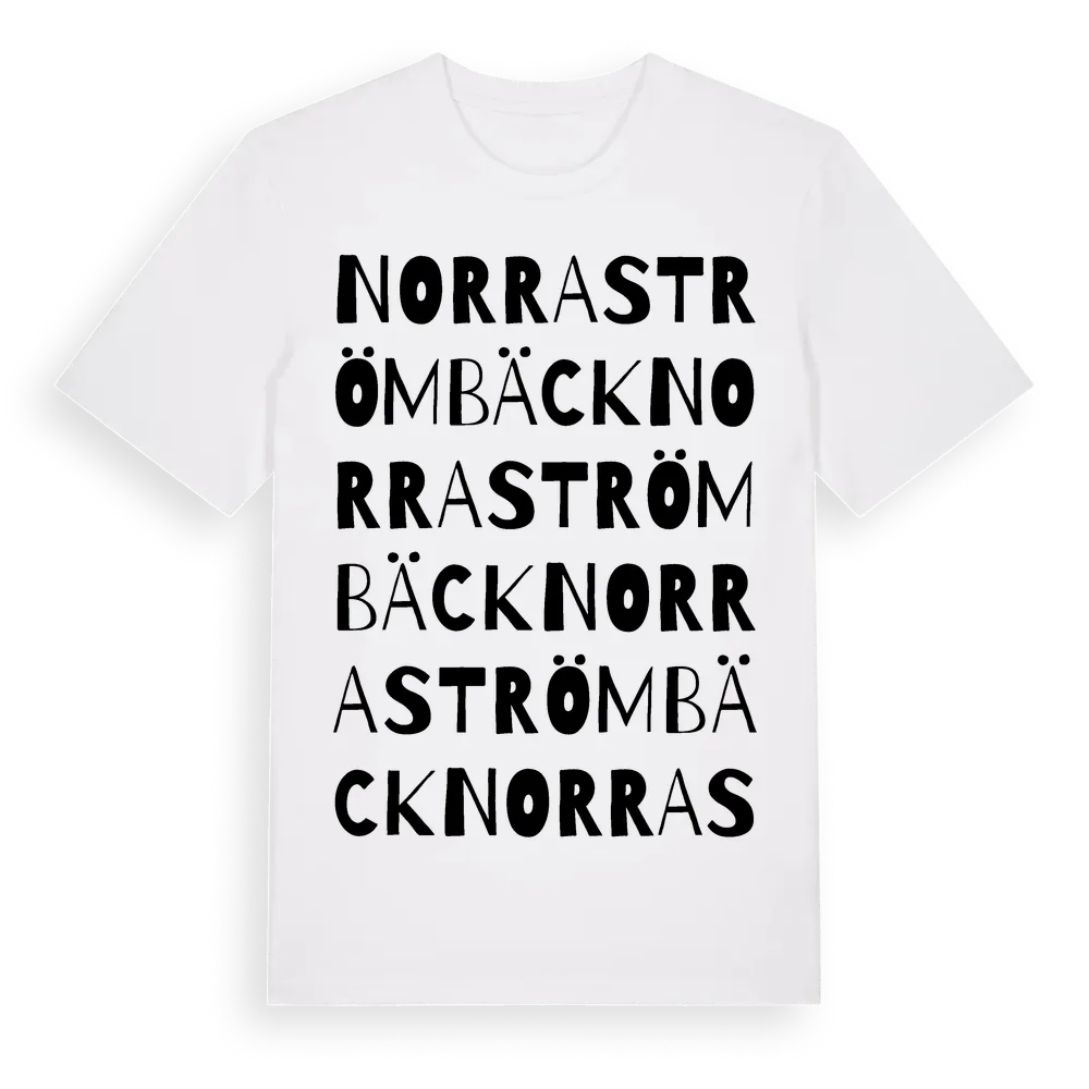 Norra Strömbäck ordlek t-shirt är inspirerad av byn Norra Strömbäck i Västerbottens län, Sverige. Tröjan är designad för dig som har en speciell koppling till platsen – oavsett om du bor här, har rötterna här eller bara älskar Norra Strömbäck.