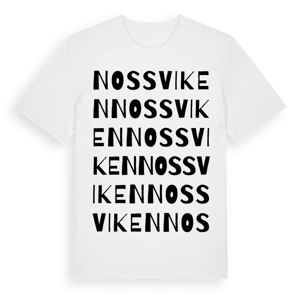 Nossviken ordlek t-shirt är inspirerad av Nossviken i Västerbottens län, Sverige. Tröjan är designad för dig som har en speciell koppling till platsen – oavsett om du bor här, har rötterna här eller bara älskar Nossviken.