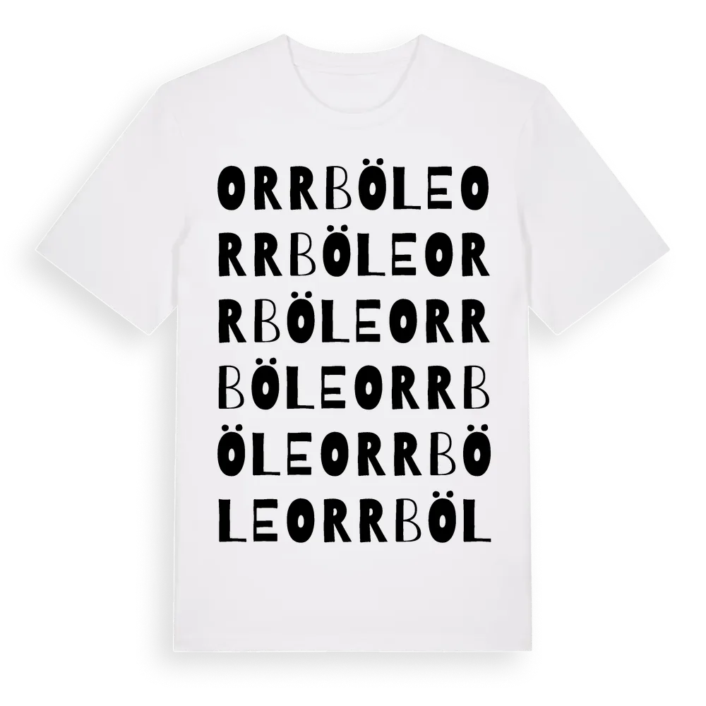 Orrböle ordlek t-shirt är inspirerad av byn Orrböle i Västerbottens län, Sverige. Tröjan är designad för dig som har en speciell koppling till platsen – oavsett om du bor här, har rötterna här eller bara älskar Orrböle.