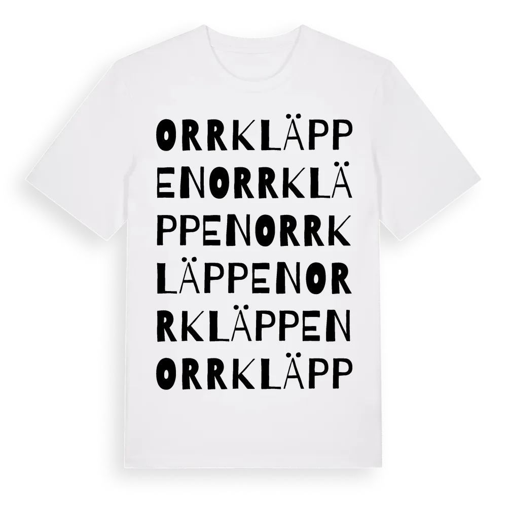 Orrkläppen ordlek t-shirt är inspirerad av Orrkläppen i Västerbottens län, Sverige. Tröjan är designad för dig som har en speciell koppling till platsen – oavsett om du bor här, har rötterna här eller bara älskar Orrkläppen.