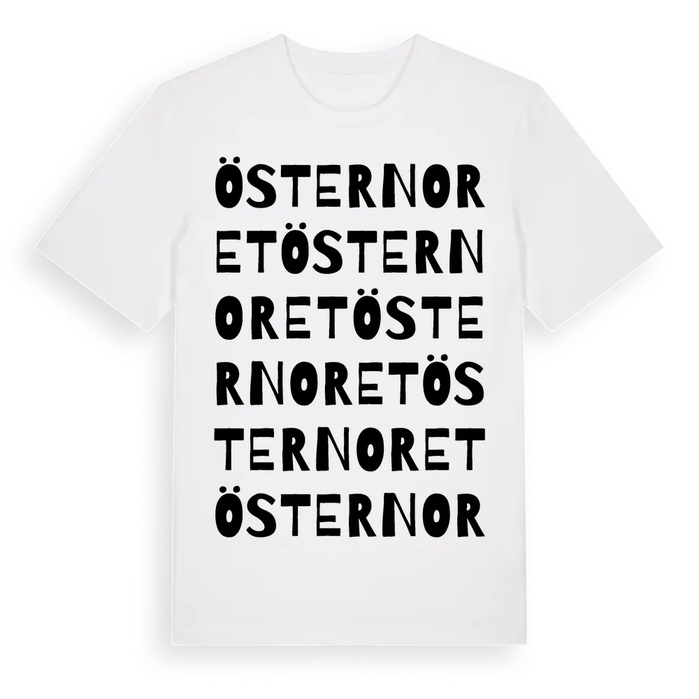Östernoret ordlek t-shirt är inspirerad av byn Östernoret i Västerbottens län, Sverige. Tröjan är designad för dig som har en speciell koppling till platsen – oavsett om du bor här, har rötterna här eller bara älskar Östernoret.