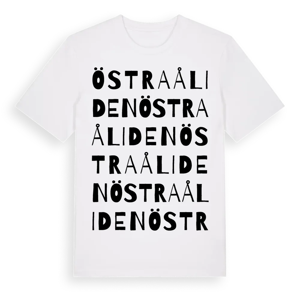 Östra Åliden ordlek t-shirt är inspirerad av byn Östra Åliden i Västerbottens län, Sverige. Tröjan är designad för dig som har en speciell koppling till platsen – oavsett om du bor här, har rötterna här eller bara älskar Östra Åliden.