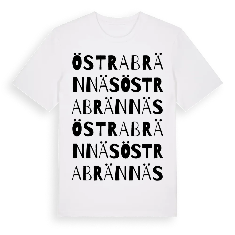 Östra Brännäs ordlek t-shirt är inspirerad av Östra Brännäs i Västerbottens län, Sverige. Tröjan är designad för dig som har en speciell koppling till platsen – oavsett om du bor här, har rötterna här eller bara älskar Östra Brännäs.