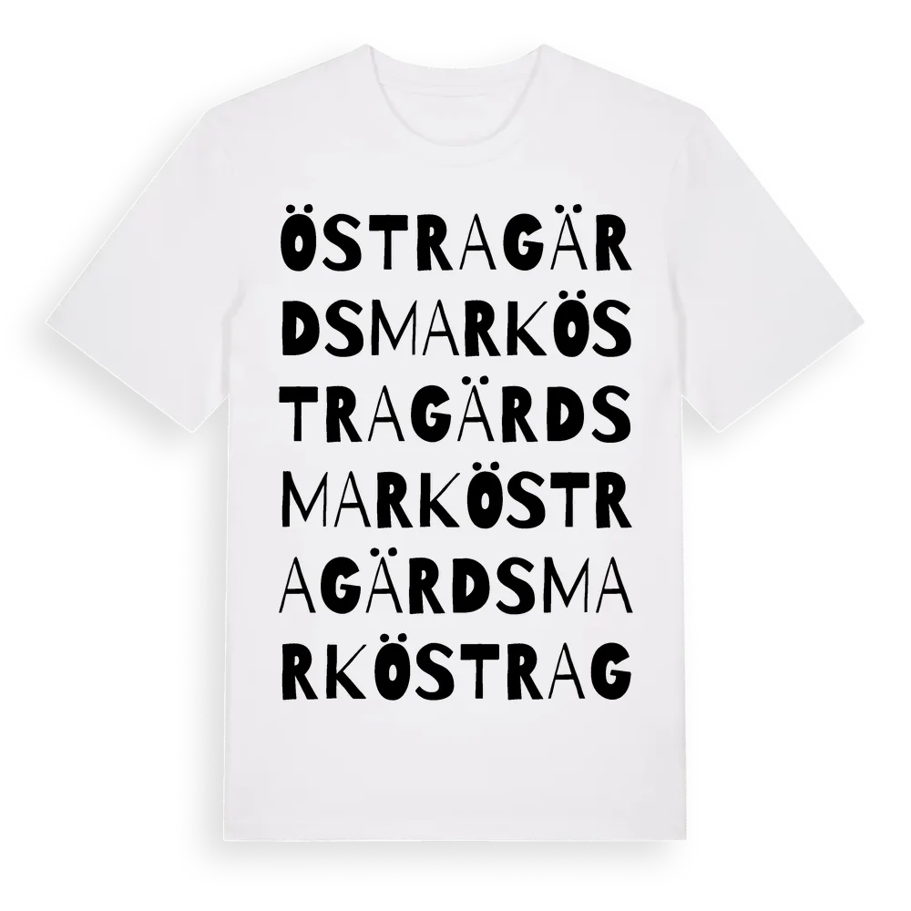 Östra Gärdsmark ordlek t-shirt är inspirerad av byn Östra Gärdsmark i Västerbottens län, Sverige. Tröjan är designad för dig som har en speciell koppling till platsen – oavsett om du bor här, har rötterna här eller bara älskar Östra Gärdsmark.