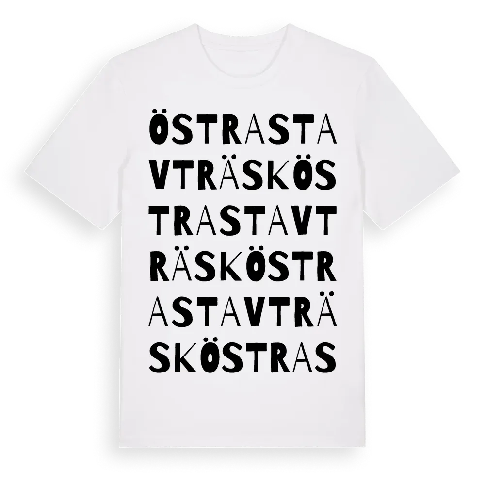 Östra Stavträsk ordlek t-shirt är inspirerad av byn Östra Stavträsk i Västerbottens län, Sverige. Tröjan är designad för dig som har en speciell koppling till platsen – oavsett om du bor här, har rötterna här eller bara älskar Östra Stavträsk.