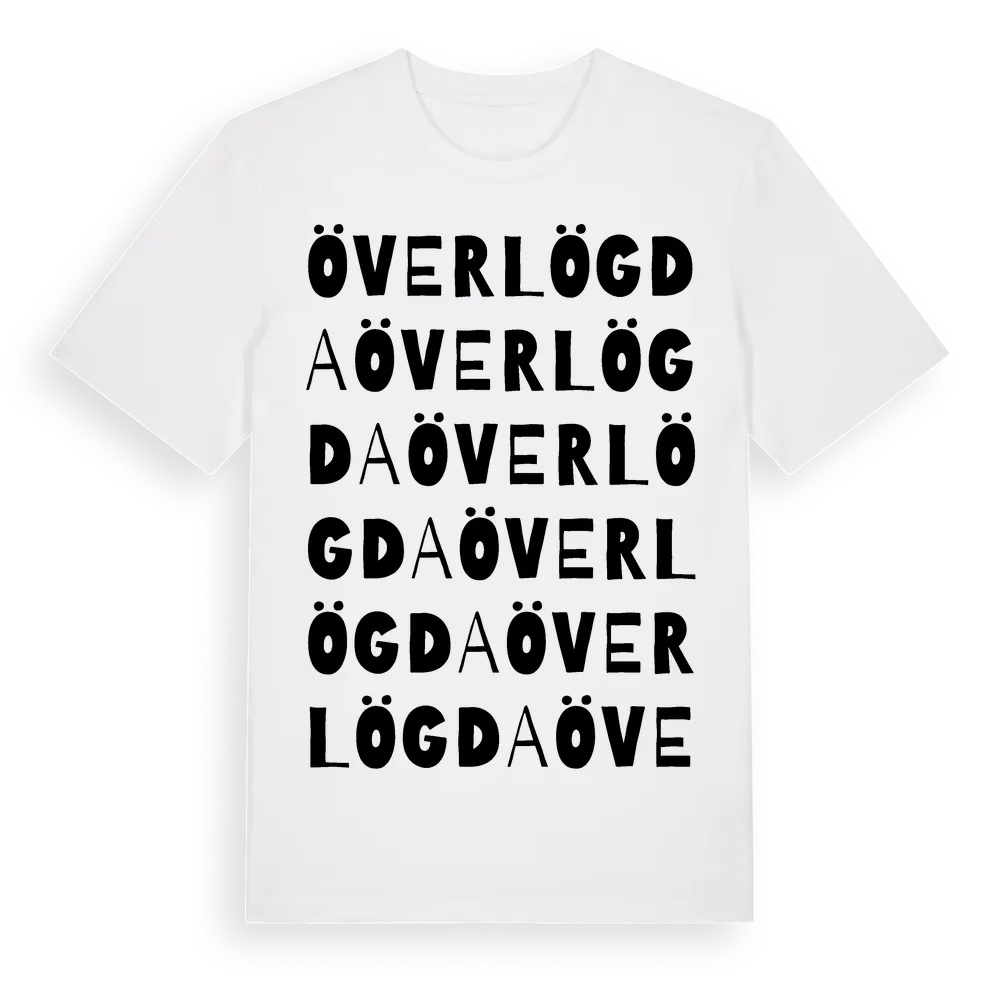 Överlögda ordlek t-shirt är inspirerad av byn Överlögda i Västerbottens län, Sverige. Tröjan är designad för dig som har en speciell koppling till platsen – oavsett om du bor här, har rötterna här eller bara älskar Överlögda.