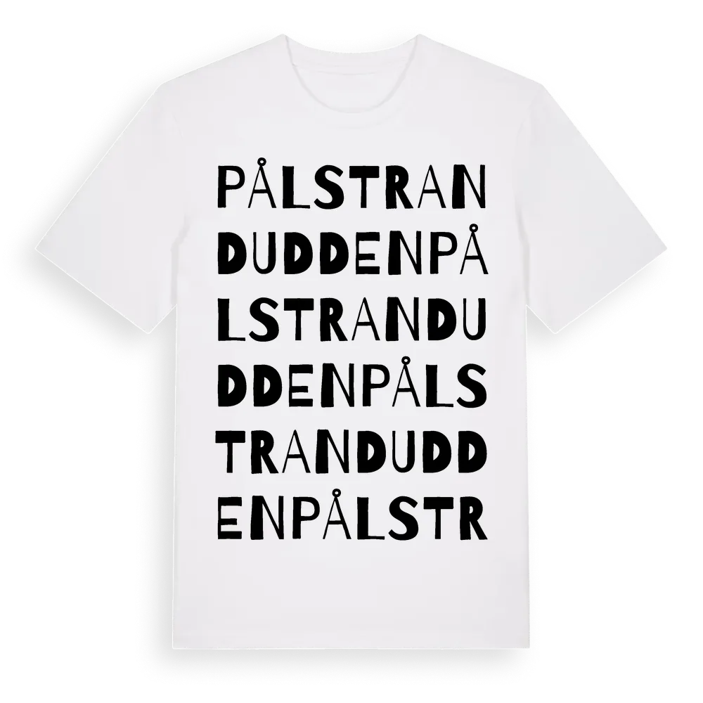 Pålstrandudden ordlek t-shirt är inspirerad av byn Pålstrandudden i Västerbottens län, Sverige. Tröjan är designad för dig som har en speciell koppling till platsen – oavsett om du bor här, har rötterna här eller bara älskar Pålstrandudden.