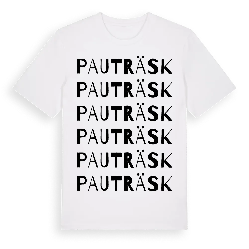 Pauträsk ordlek t-shirt är inspirerad av byn Pauträsk i Västerbottens län, Sverige. Tröjan är designad för dig som har en speciell koppling till platsen – oavsett om du bor här, har rötterna här eller bara älskar Pauträsk.