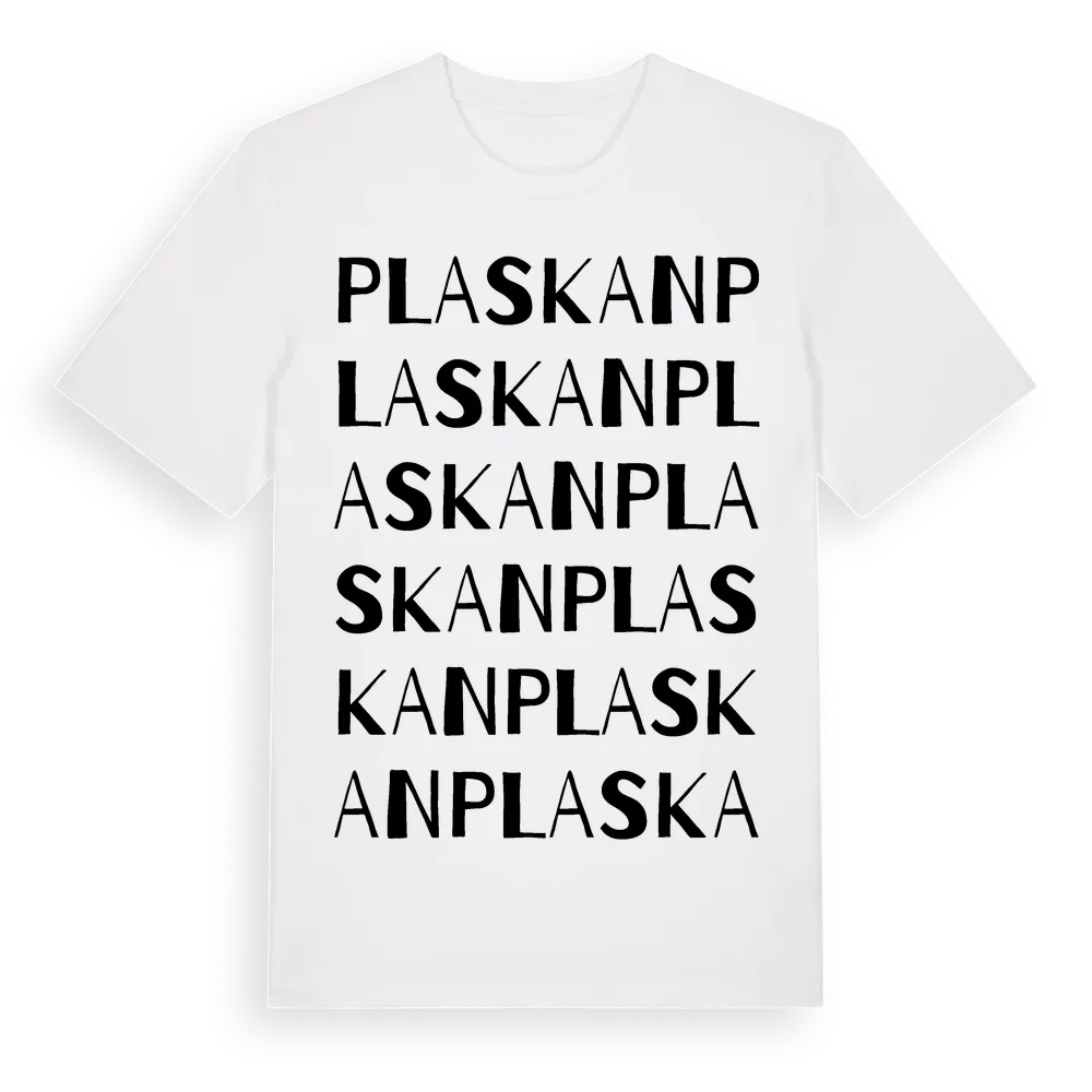 Plaskan ordlek t-shirt är inspirerad av Plaskan i Västerbottens län, Sverige. Tröjan är designad för dig som har en speciell koppling till platsen – oavsett om du bor här, har rötterna här eller bara älskar Plaskan.