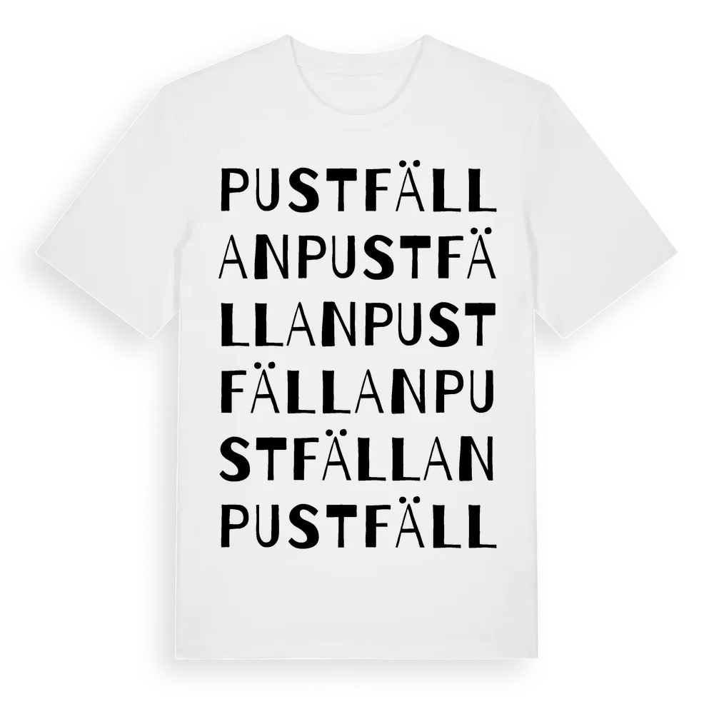 Pustfällan ordlek t-shirt är inspirerad av Pustfällan i Västerbottens län, Sverige. Tröjan är designad för dig som har en speciell koppling till platsen – oavsett om du bor här, har rötterna här eller bara älskar Pustfällan.