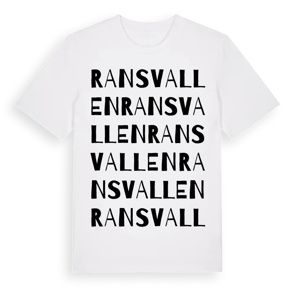 Ransvallen ordlek t-shirt är inspirerad av byn Ransvallen i Västerbottens län, Sverige. Tröjan är designad för dig som har en speciell koppling till platsen – oavsett om du bor här, har rötterna här eller bara älskar Ransvallen.
