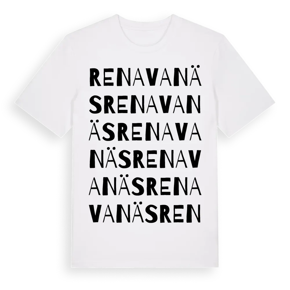 Renavanäs ordlek t-shirt är inspirerad av Renavanäs i Västerbottens län, Sverige. Tröjan är designad för dig som har en speciell koppling till platsen – oavsett om du bor här, har rötterna här eller bara älskar Renavanäs.