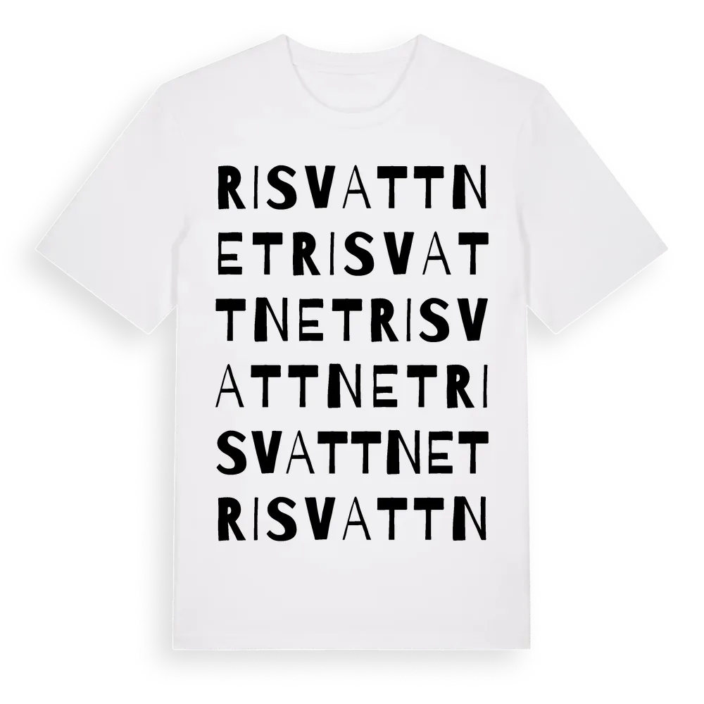 Risvattnet ordlek t-shirt är inspirerad av byn Risvattnet i Västerbottens län, Sverige. Tröjan är designad för dig som har en speciell koppling till platsen – oavsett om du bor här, har rötterna här eller bara älskar Risvattnet.
