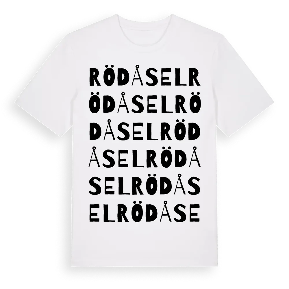 Rödåsel ordlek t-shirt är inspirerad av byn Rödåsel i Västerbottens län, Sverige. Tröjan är designad för dig som har en speciell koppling till platsen – oavsett om du bor här, har rötterna här eller bara älskar Rödåsel.