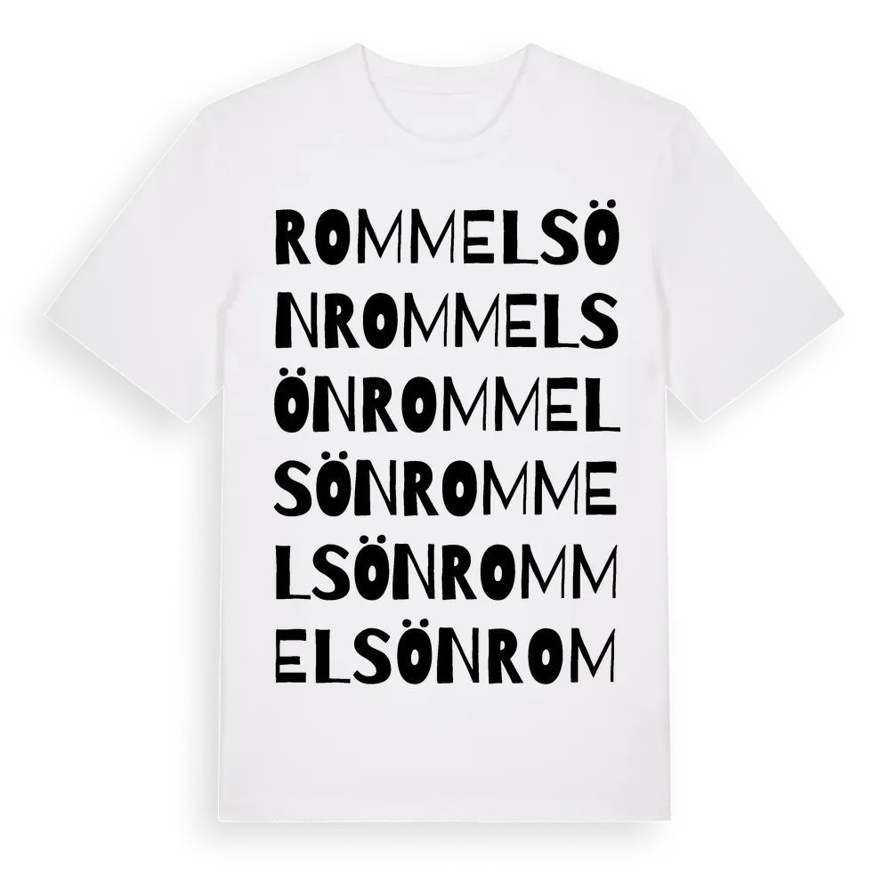 Rommelsön ordlek t-shirt är inspirerad av ön Rommelsön i Västerbottens län, Sverige. Tröjan är designad för dig som har en speciell koppling till platsen – oavsett om du bor här, har rötterna här eller bara älskar Rommelsön.