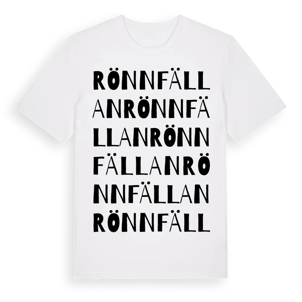 Rönnfällan ordlek t-shirt är inspirerad av byn Rönnfällan i Västerbottens län, Sverige. Tröjan är designad för dig som har en speciell koppling till platsen – oavsett om du bor här, har rötterna här eller bara älskar Rönnfällan.