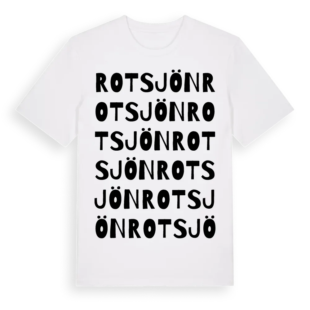 Rotsjön ordlek t-shirt är inspirerad av byn Rotsjön i Västerbottens län, Sverige. Tröjan är designad för dig som har en speciell koppling till platsen – oavsett om du bor här, har rötterna här eller bara älskar Rotsjön.