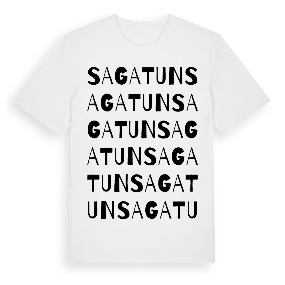 Sagatun ordlek t-shirt är inspirerad av byn Sagatun i Västerbottens län, Sverige. Tröjan är designad för dig som har en speciell koppling till platsen – oavsett om du bor här, har rötterna här eller bara älskar Sagatun.