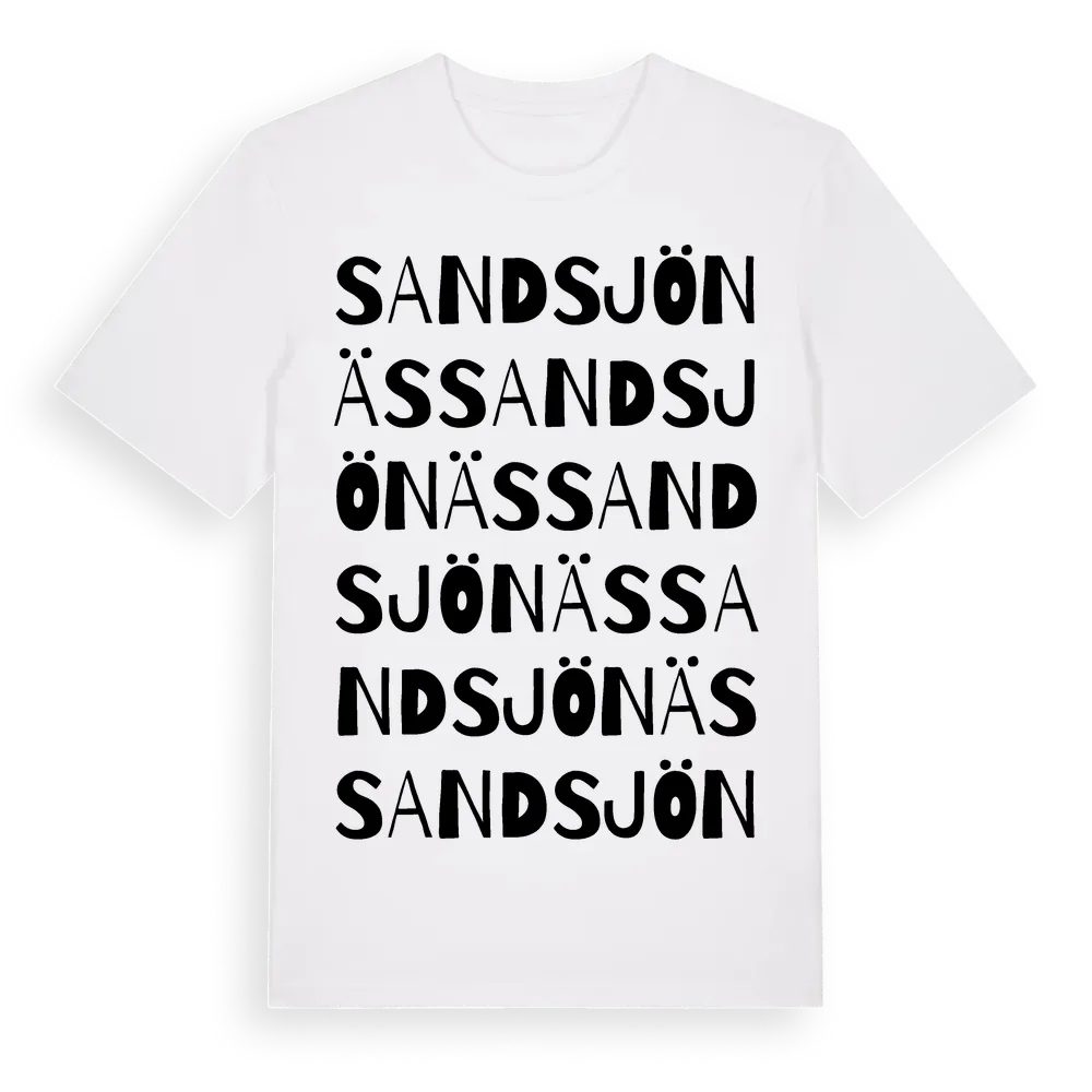 Sandsjönäs ordlek t-shirt är inspirerad av Sandsjönäs i Västerbottens län, Sverige. Tröjan är designad för dig som har en speciell koppling till platsen – oavsett om du bor här, har rötterna här eller bara älskar Sandsjönäs.