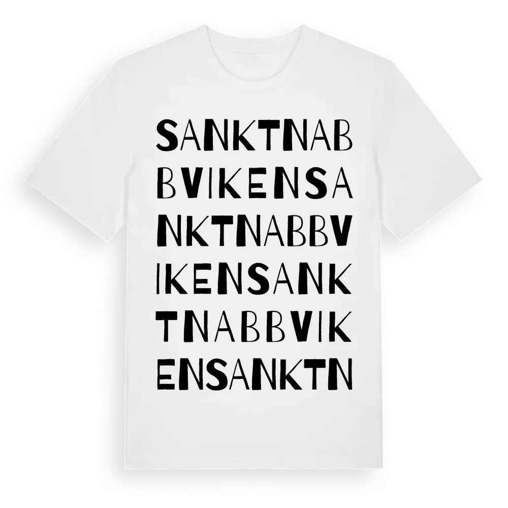 Sankt Nabbviken ordlek t-shirt är inspirerad av byn Sankt Nabbviken i Västerbottens län, Sverige. Tröjan är designad för dig som har en speciell koppling till platsen – oavsett om du bor här, har rötterna här eller bara älskar Sankt Nabbviken.