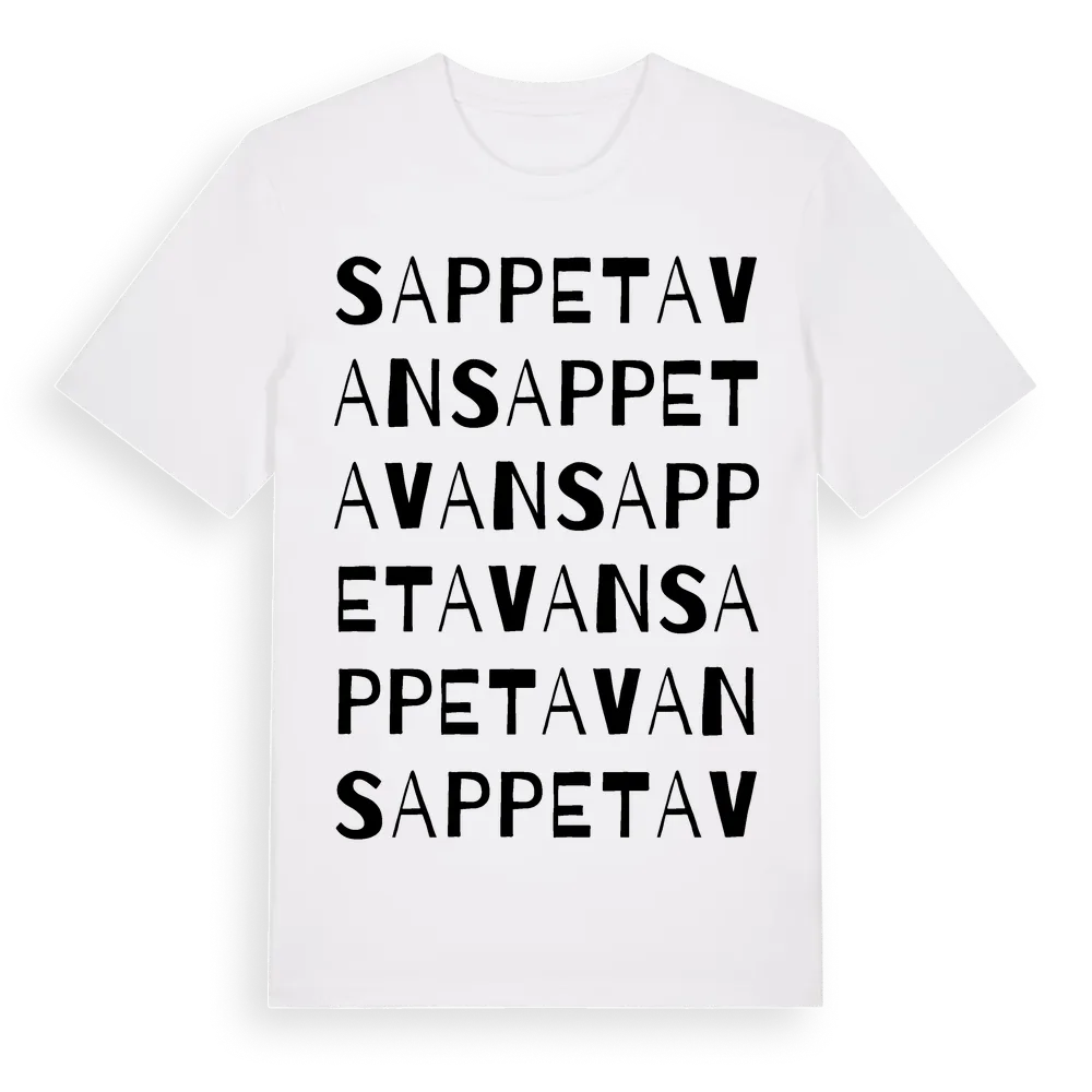 Sappetavan ordlek t-shirt är inspirerad av byn Sappetavan i Västerbottens län, Sverige. Tröjan är designad för dig som har en speciell koppling till platsen – oavsett om du bor här, har rötterna här eller bara älskar Sappetavan.