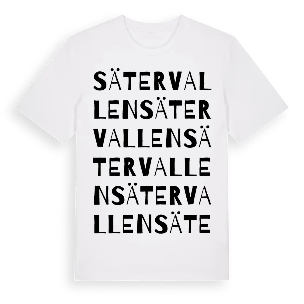Sätervallen ordlek t-shirt är inspirerad av Sätervallen i Västerbottens län, Sverige. Tröjan är designad för dig som har en speciell koppling till platsen – oavsett om du bor här, har rötterna här eller bara älskar Sätervallen.