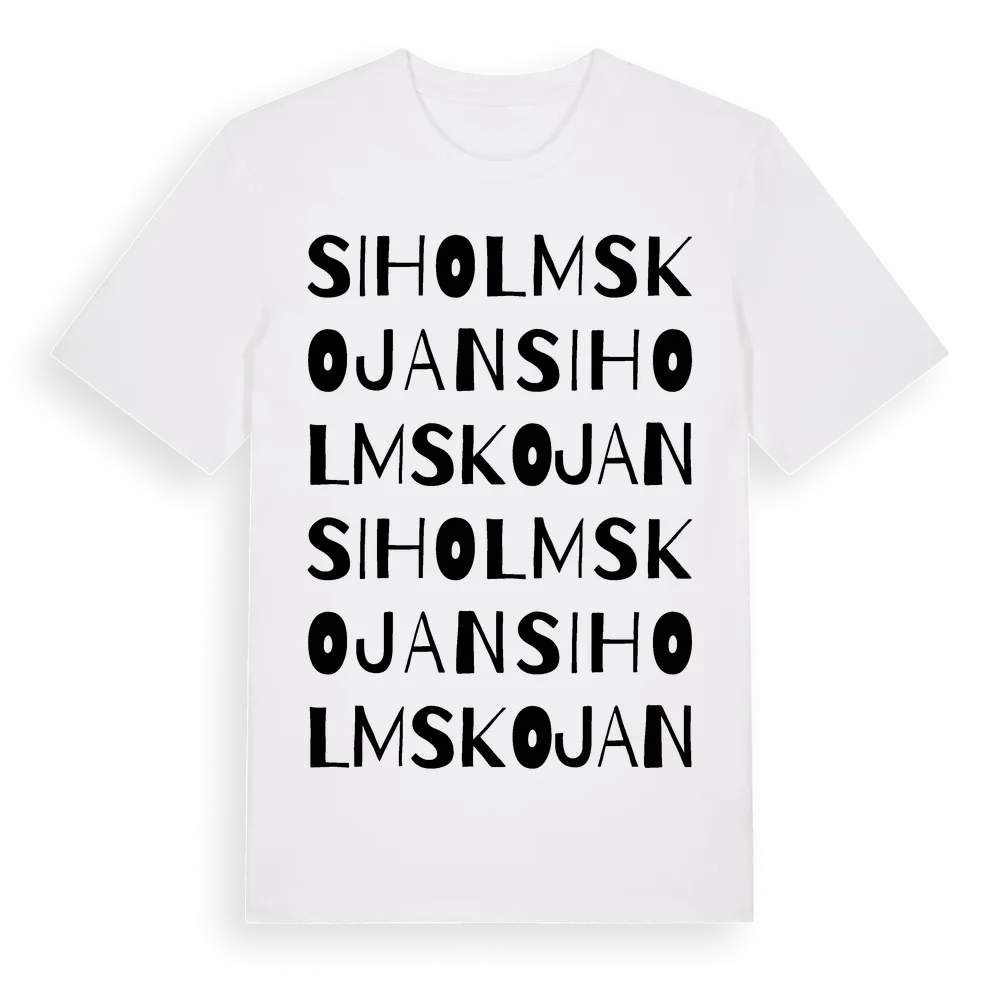 Siholmskojan ordlek t-shirt är inspirerad av Siholmskojan i Västerbottens län, Sverige. Tröjan är designad för dig som har en speciell koppling till platsen – oavsett om du bor här, har rötterna här eller bara älskar Siholmskojan.