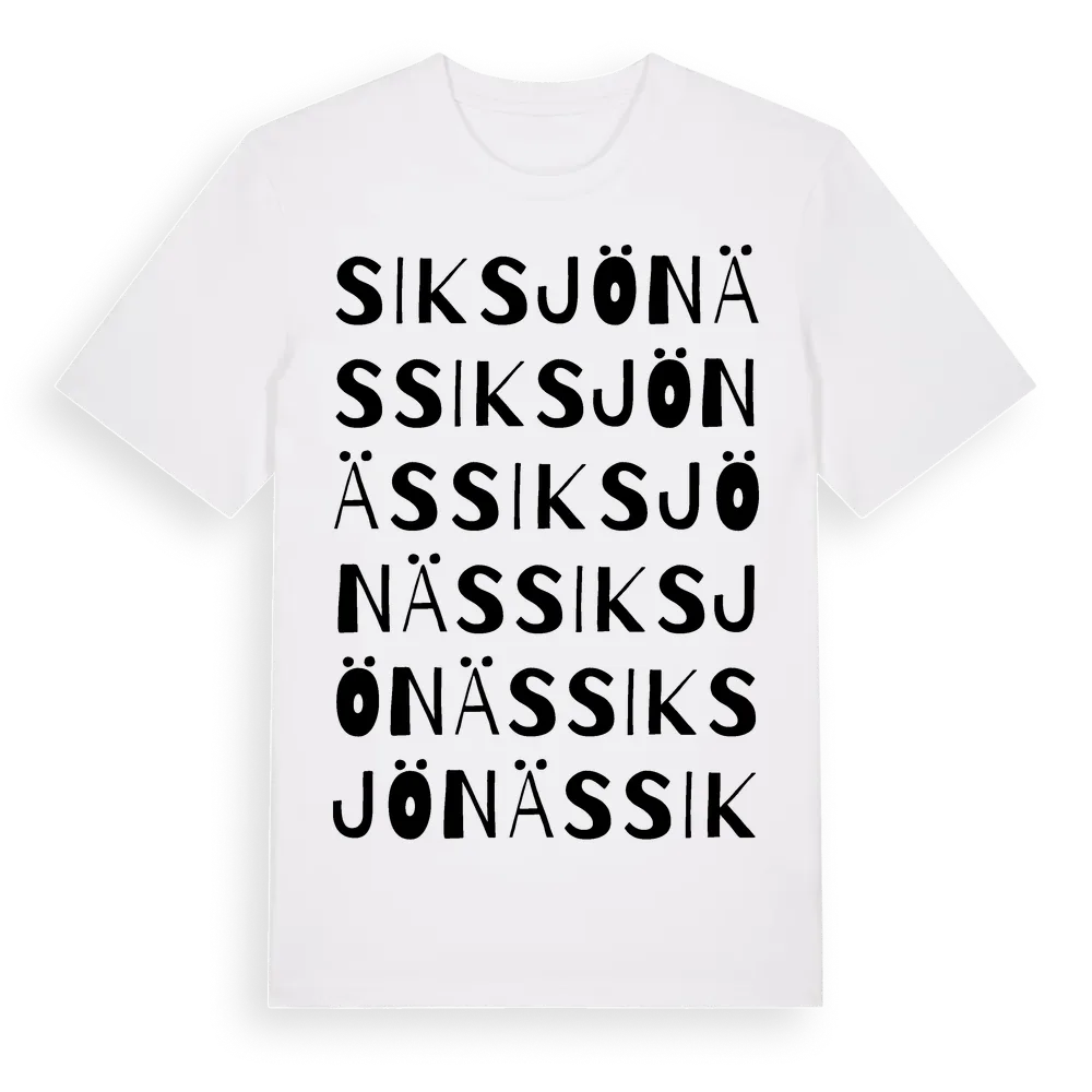 Siksjönäs ordlek t-shirt är inspirerad av byn Siksjönäs i Västerbottens län, Sverige. Tröjan är designad för dig som har en speciell koppling till platsen – oavsett om du bor här, har rötterna här eller bara älskar Siksjönäs.