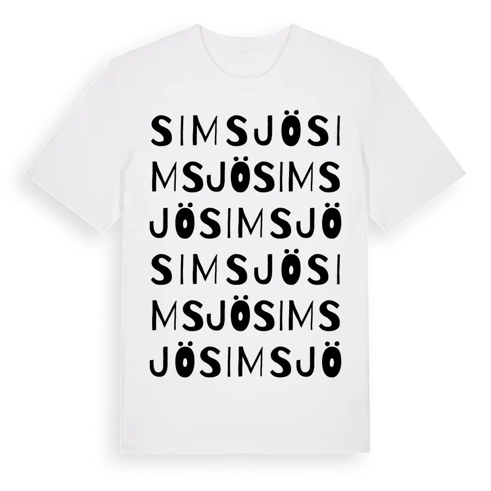 Simsjö ordlek t-shirt är inspirerad av Simsjö i Västerbottens län, Sverige. Tröjan är designad för dig som har en speciell koppling till platsen – oavsett om du bor här, har rötterna här eller bara älskar Simsjö.