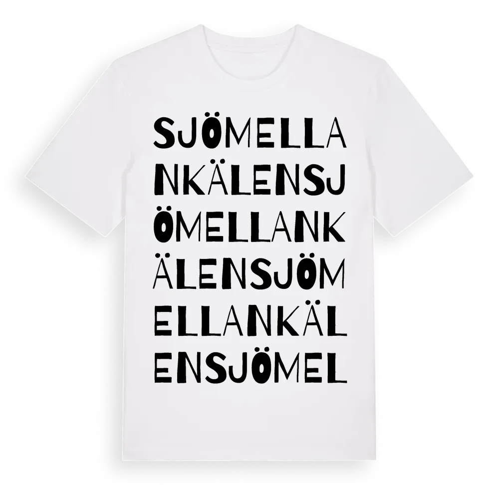Sjömellankälen ordlek t-shirt är inspirerad av byn Sjömellankälen i Västerbottens län, Sverige. Tröjan är designad för dig som har en speciell koppling till platsen – oavsett om du bor här, har rötterna här eller bara älskar Sjömellankälen.