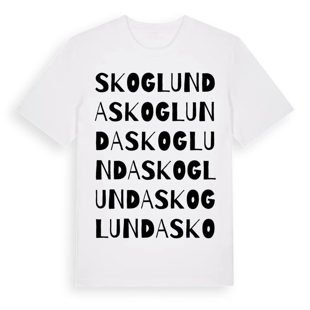 Skoglunda ordlek t-shirt är inspirerad av Skoglunda i Västerbottens län, Sverige. Tröjan är designad för dig som har en speciell koppling till platsen – oavsett om du bor här, har rötterna här eller bara älskar Skoglunda.