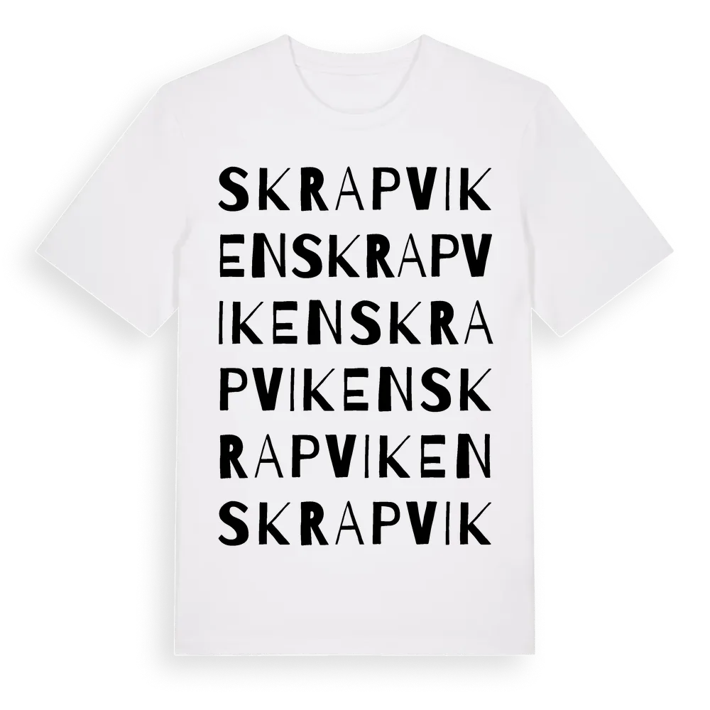 Skrapviken ordlek t-shirt är inspirerad av Skrapviken i Västerbottens län, Sverige. Tröjan är designad för dig som har en speciell koppling till platsen – oavsett om du bor här, har rötterna här eller bara älskar Skrapviken.