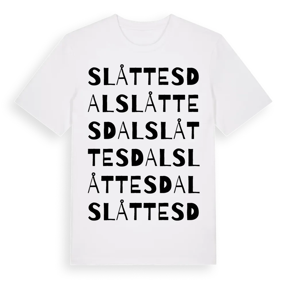 Slåttesdal ordlek t-shirt är inspirerad av Slåttesdal i Västerbottens län, Sverige. Tröjan är designad för dig som har en speciell koppling till platsen – oavsett om du bor här, har rötterna här eller bara älskar Slåttesdal.