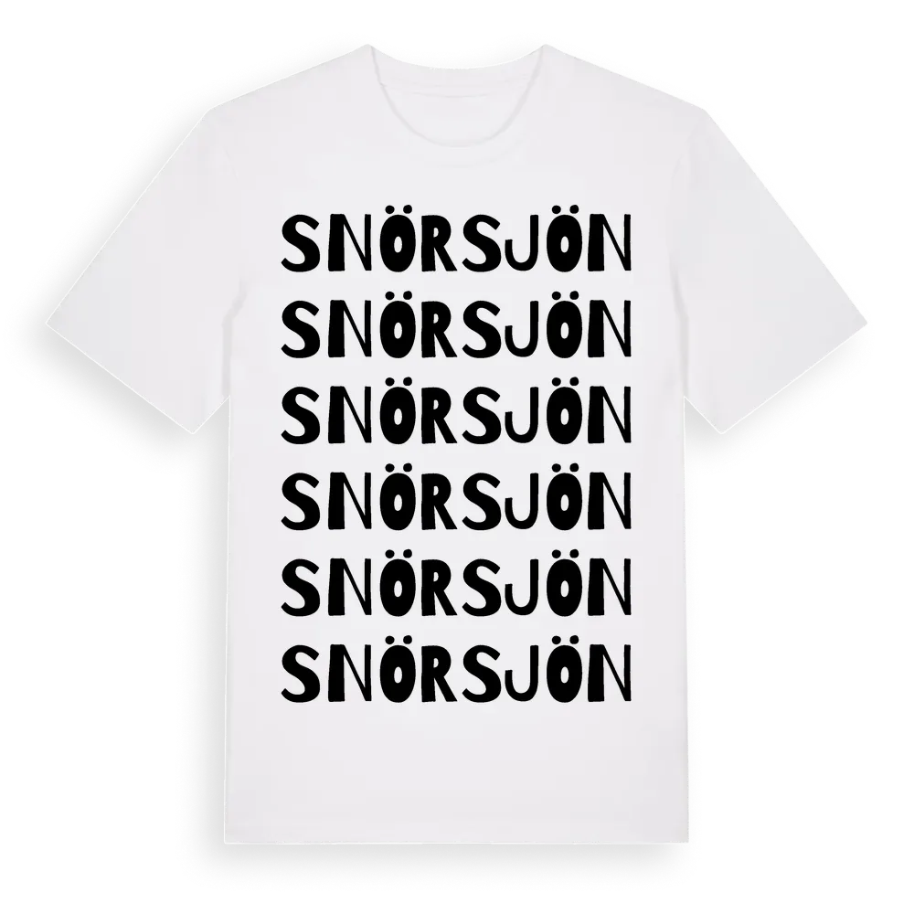 Snörsjön ordlek t-shirt är inspirerad av byn Snörsjön i Västerbottens län, Sverige. Tröjan är designad för dig som har en speciell koppling till platsen – oavsett om du bor här, har rötterna här eller bara älskar Snörsjön.