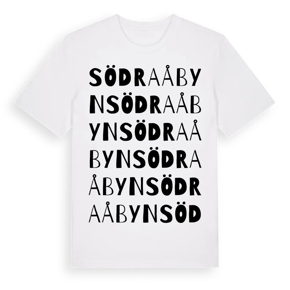 Södra Åbyn ordlek t-shirt är inspirerad av byn Södra Åbyn i Västerbottens län, Sverige. Tröjan är designad för dig som har en speciell koppling till platsen – oavsett om du bor här, har rötterna här eller bara älskar Södra Åbyn.