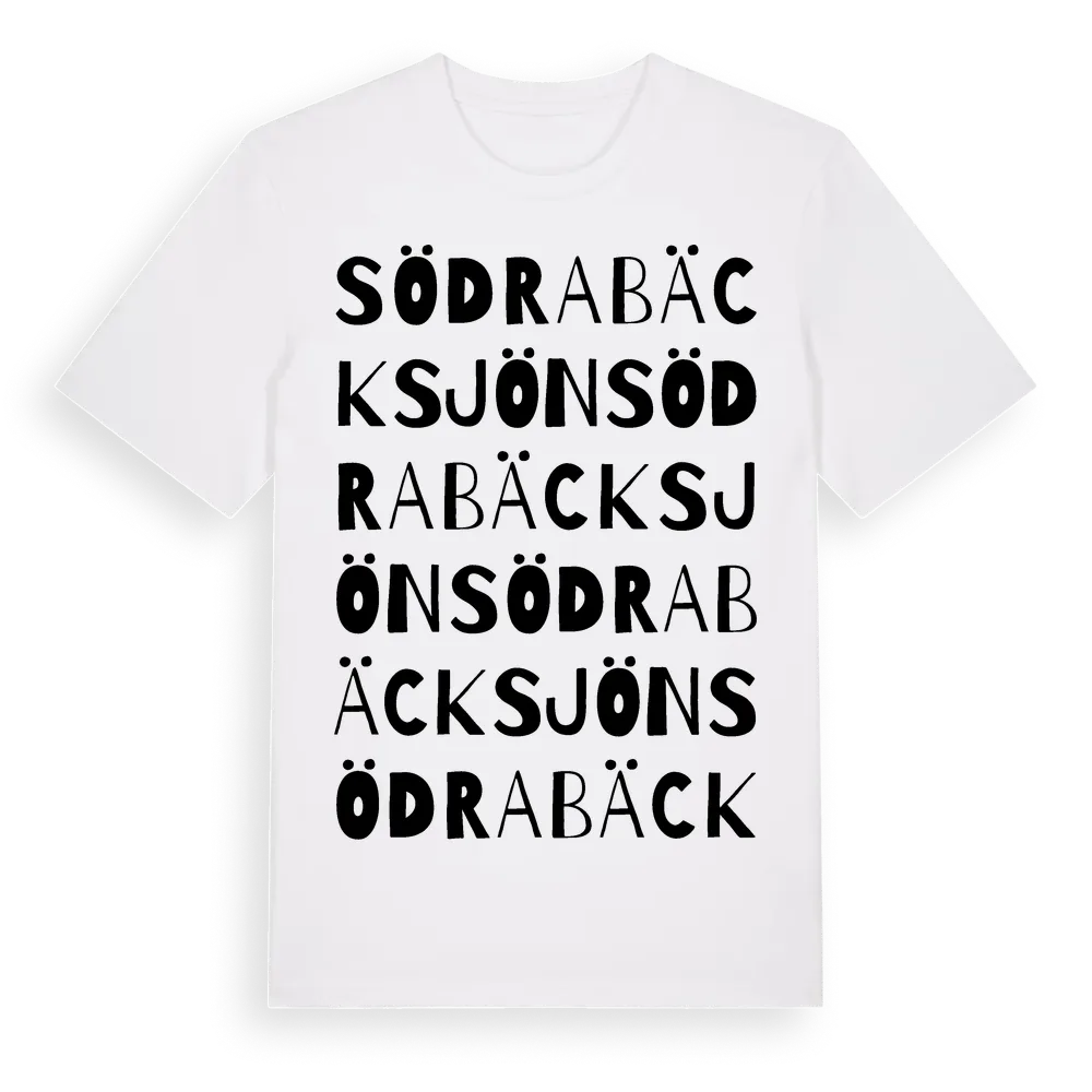Södra Bäcksjön ordlek t-shirt är inspirerad av byn Södra Bäcksjön i Västerbottens län, Sverige. Tröjan är designad för dig som har en speciell koppling till platsen – oavsett om du bor här, har rötterna här eller bara älskar Södra Bäcksjön.