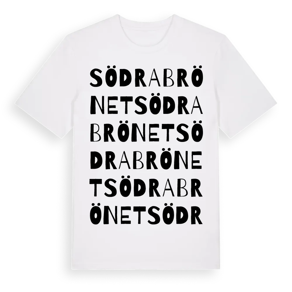 Södra Brönet ordlek t-shirt är inspirerad av byn Södra Brönet i Västerbottens län, Sverige. Tröjan är designad för dig som har en speciell koppling till platsen – oavsett om du bor här, har rötterna här eller bara älskar Södra Brönet.
