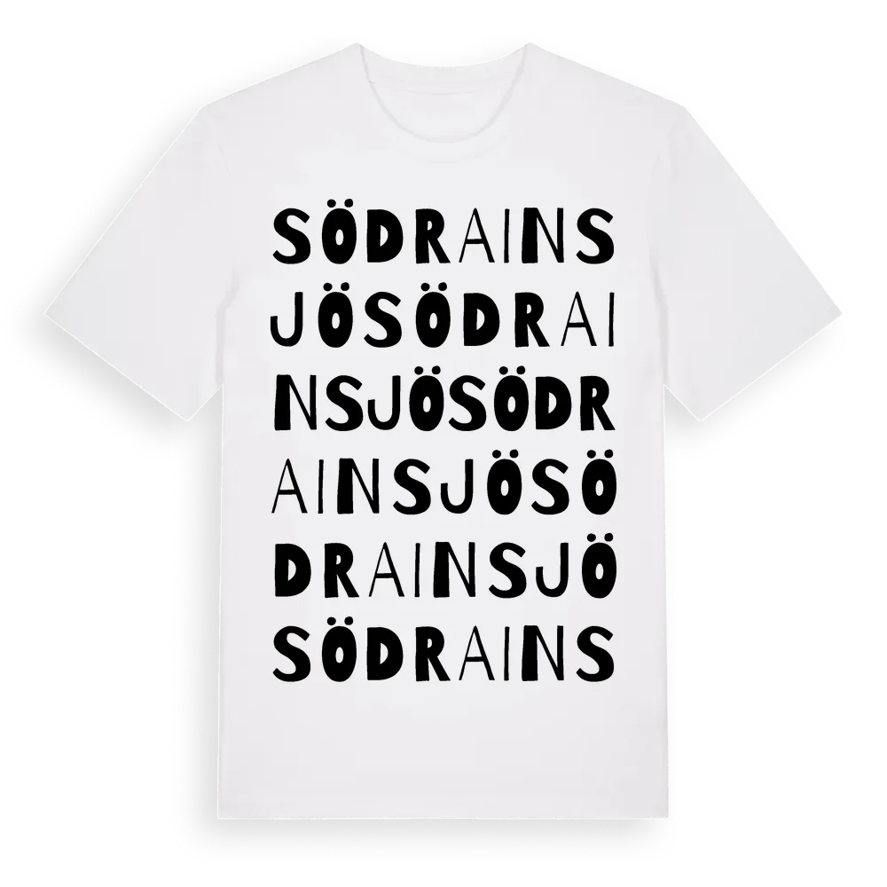 Södra Insjö ordlek t-shirt är inspirerad av byn Södra Insjö i Västerbottens län, Sverige. Tröjan är designad för dig som har en speciell koppling till platsen – oavsett om du bor här, har rötterna här eller bara älskar Södra Insjö.