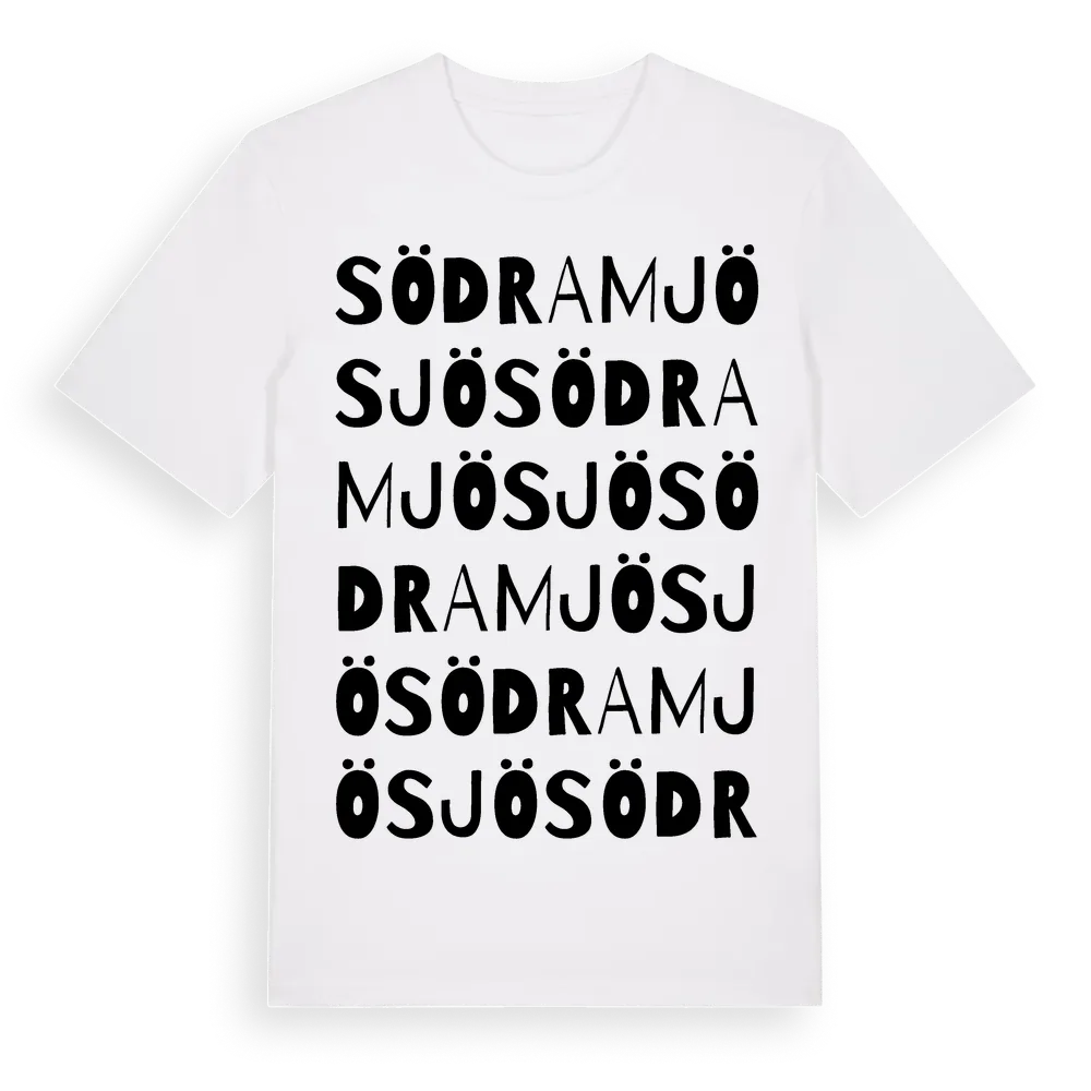 Södra Mjösjö ordlek t-shirt är inspirerad av byn Södra Mjösjö i Västerbottens län, Sverige. Tröjan är designad för dig som har en speciell koppling till platsen – oavsett om du bor här, har rötterna här eller bara älskar Södra Mjösjö.