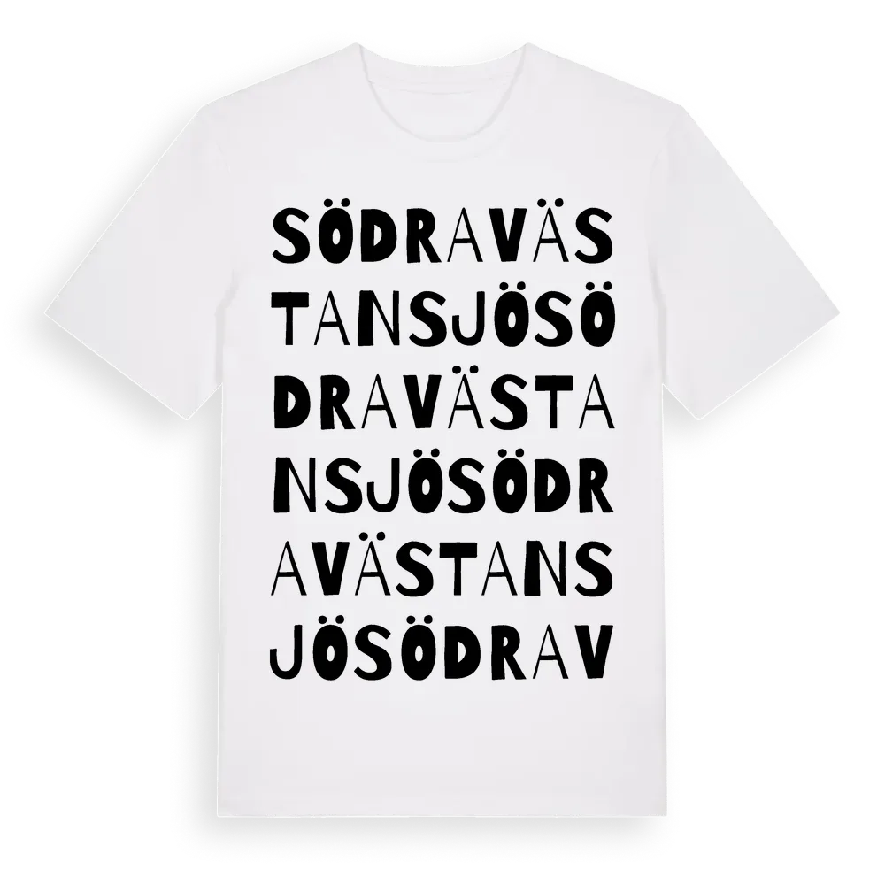 Södra Västansjö ordlek t-shirt är inspirerad av byn Södra Västansjö i Västerbottens län, Sverige. Tröjan är designad för dig som har en speciell koppling till platsen – oavsett om du bor här, har rötterna här eller bara älskar Södra Västansjö.