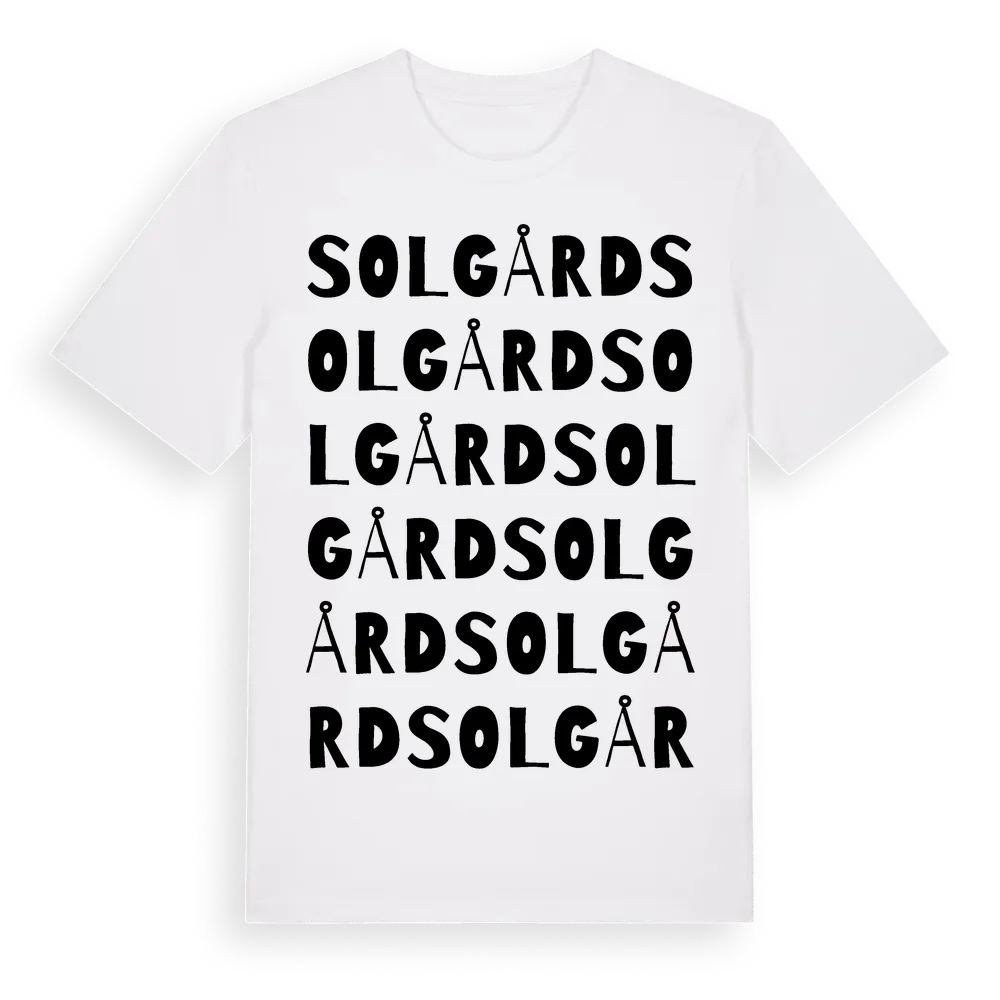 Solgård ordlek t-shirt är inspirerad av Solgård i Västerbottens län, Sverige. Tröjan är designad för dig som har en speciell koppling till platsen – oavsett om du bor här, har rötterna här eller bara älskar Solgård.