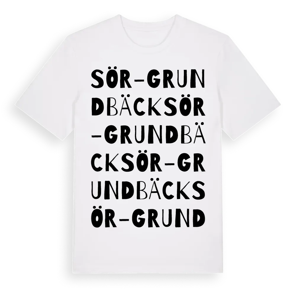 Sör-Grundbäck ordlek t-shirt är inspirerad av byn Sör-Grundbäck i Västerbottens län, Sverige. Tröjan är designad för dig som har en speciell koppling till platsen – oavsett om du bor här, har rötterna här eller bara älskar Sör-Grundbäck.