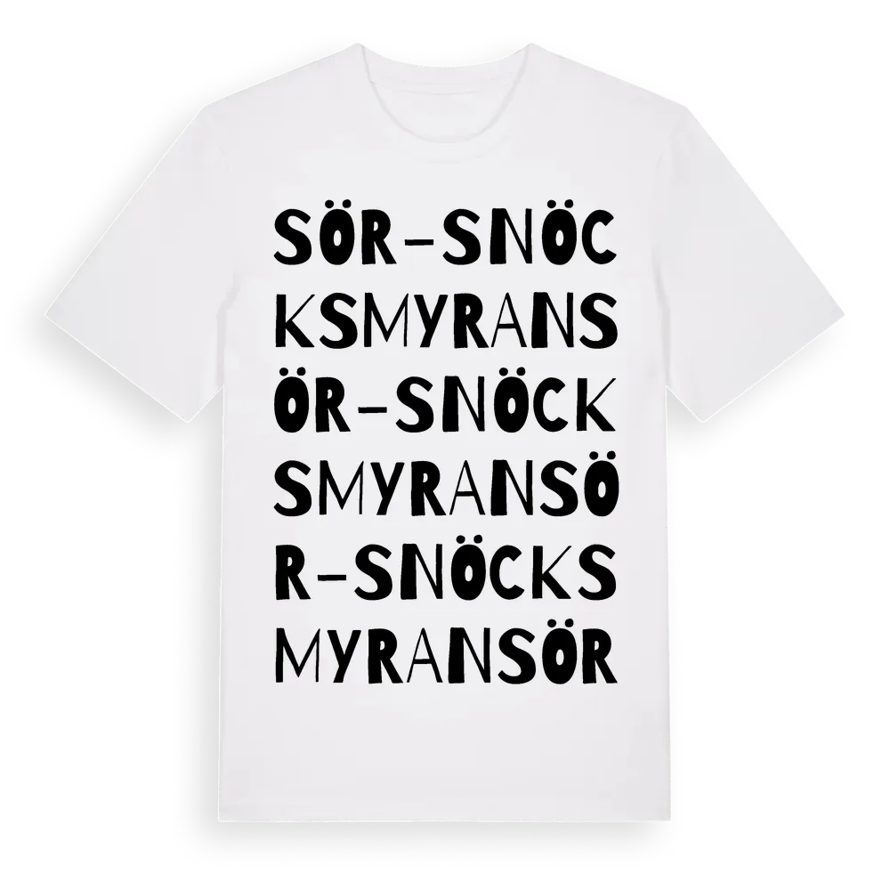 Sör-Snöcksmyran ordlek t-shirt är inspirerad av Sör-Snöcksmyran i Västerbottens län, Sverige. Tröjan är designad för dig som har en speciell koppling till platsen – oavsett om du bor här, har rötterna här eller bara älskar Sör-Snöcksmyran.