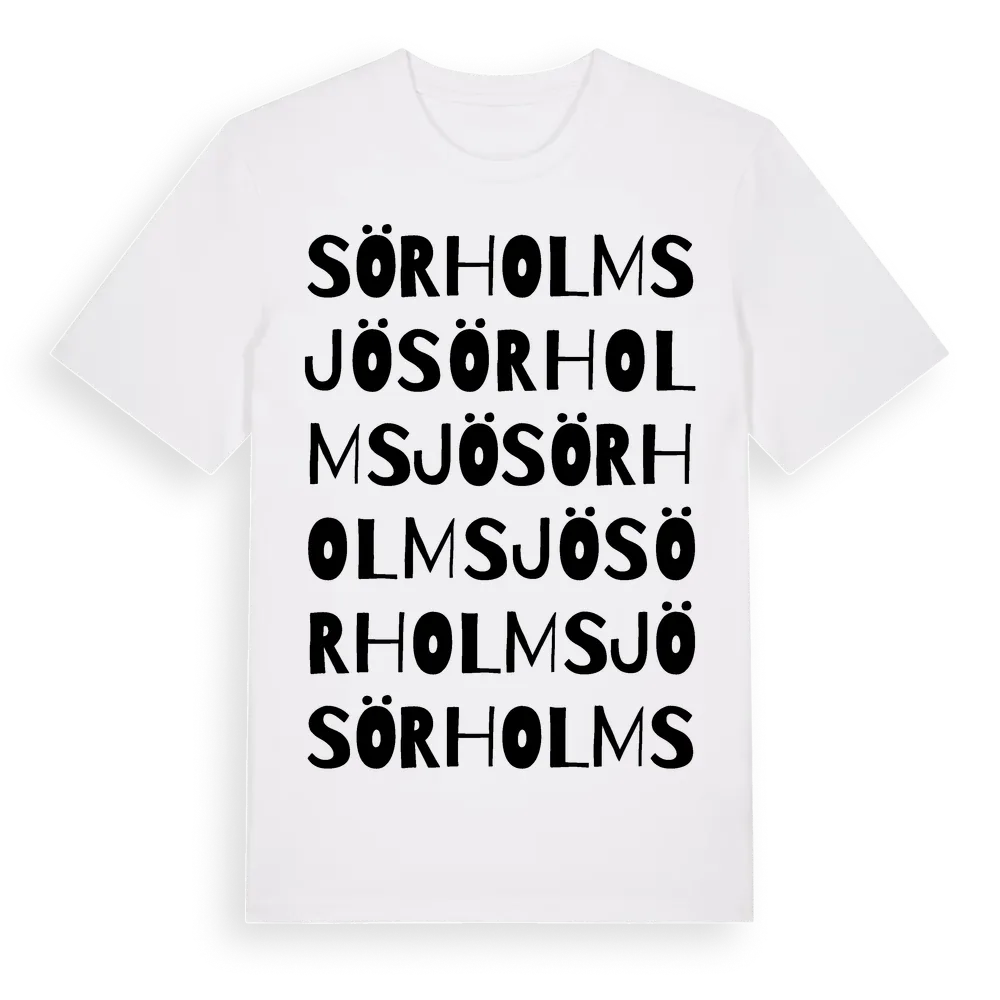 Sörholmsjö ordlek t-shirt är inspirerad av byn Sörholmsjö i Västerbottens län, Sverige. Tröjan är designad för dig som har en speciell koppling till platsen – oavsett om du bor här, har rötterna här eller bara älskar Sörholmsjö.