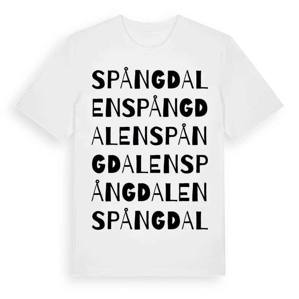 Spångdalen ordlek t-shirt är inspirerad av byn Spångdalen i Västerbottens län, Sverige. Tröjan är designad för dig som har en speciell koppling till platsen – oavsett om du bor här, har rötterna här eller bara älskar Spångdalen.