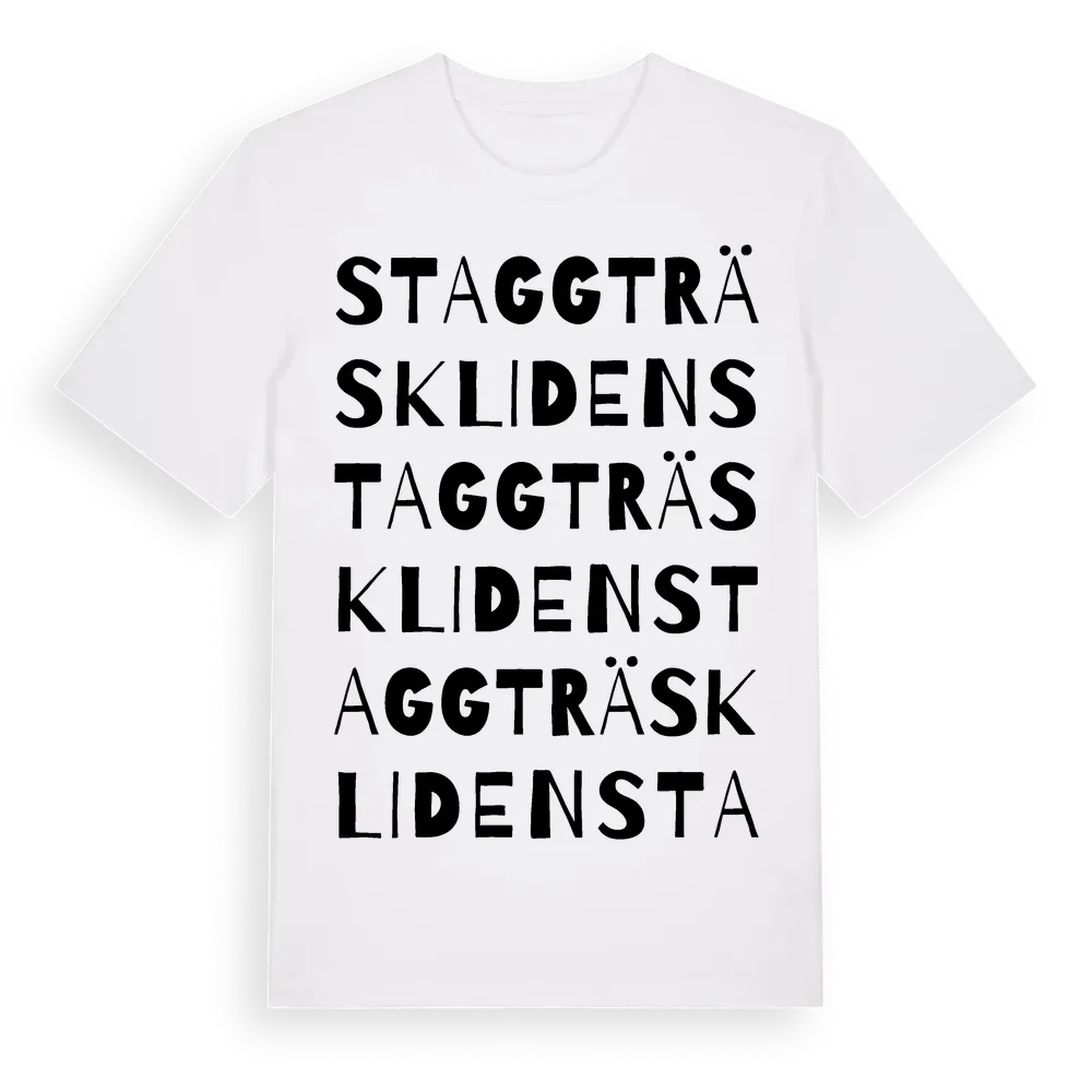 Staggträskliden ordlek t-shirt är inspirerad av Staggträskliden i Västerbottens län, Sverige. Tröjan är designad för dig som har en speciell koppling till platsen – oavsett om du bor här, har rötterna här eller bara älskar Staggträskliden.